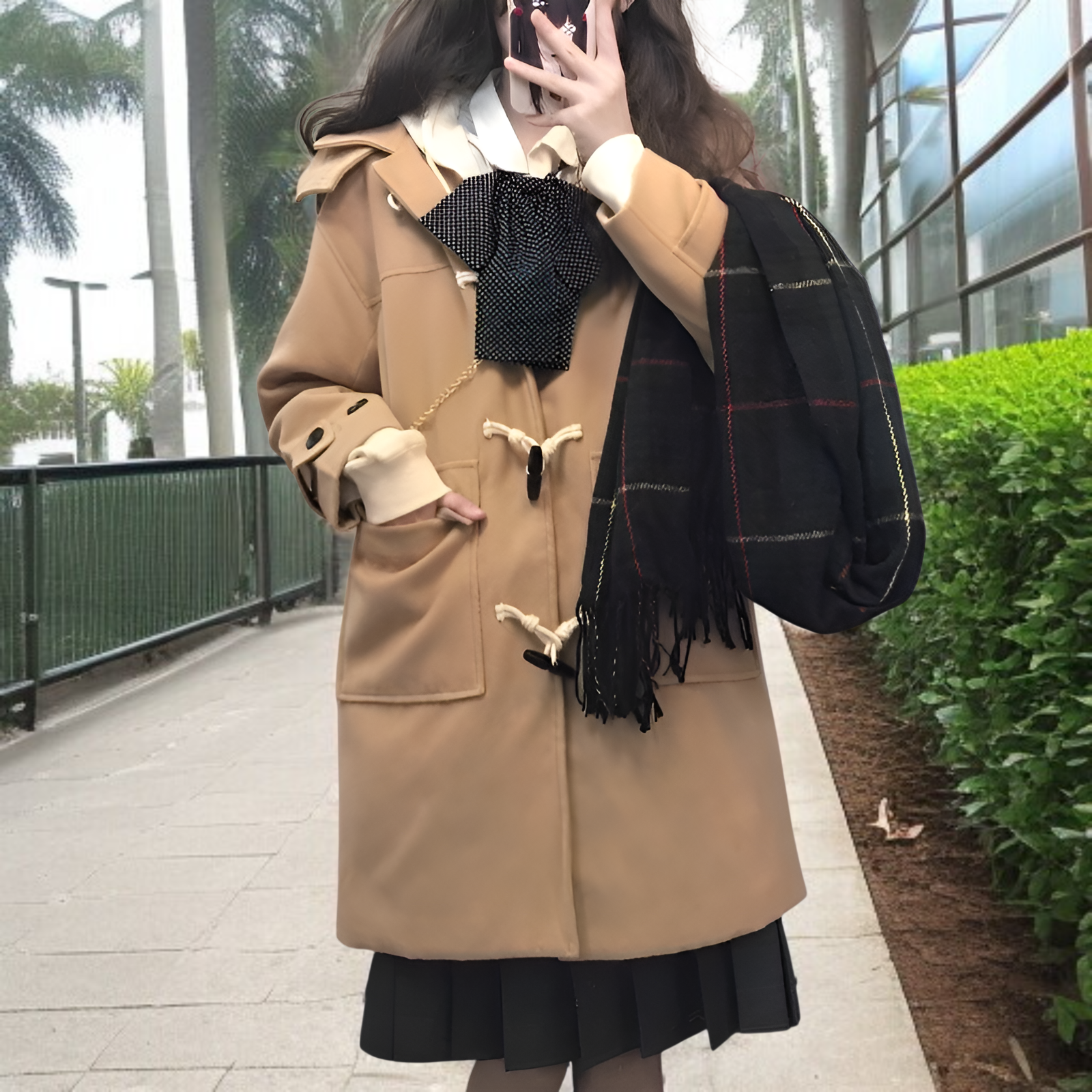 JKホーンボタンウールコート レディース 秋冬カレッジスタイル全身コーディネート